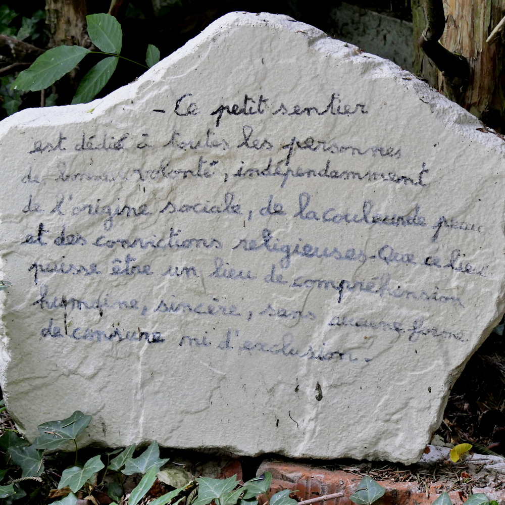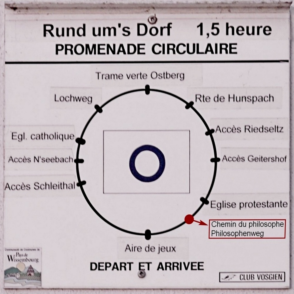 Vor etwa 10 Jahren angelegt von einem älteren Herrn und einer jugendlichen Schauspielgruppe, säumen ihn kleine Tafeln mit philosophischen Lebensweisheiten. Fernab der Tageshektik vermittelt er Ruhe und regt zum Nachdenken an. Die Gedanken berühmter Personen aus dem weltlichen und religiösen Leben mahnen uns zu Toleranz und Menschlichkeit. In einer kleinen Hütte am Weg findet man die französisch-deutsche Übersetzung der meisten Aphorismen. Allen gemeinsam ist das Streben nach kritischem und doch respektvollen Umgang miteinander, gleich welcher Rasse, Religion oder politischer Weltanschauung wir angehören!